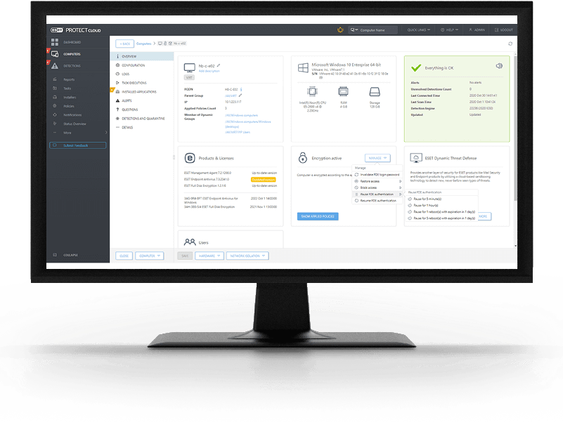 Manage full disk encryption across your entire network from a cloud‑based console. ESET PROTECT single pane of glass allows admins to deploy, activate and manage encryption on their connected endpoints with a single click.